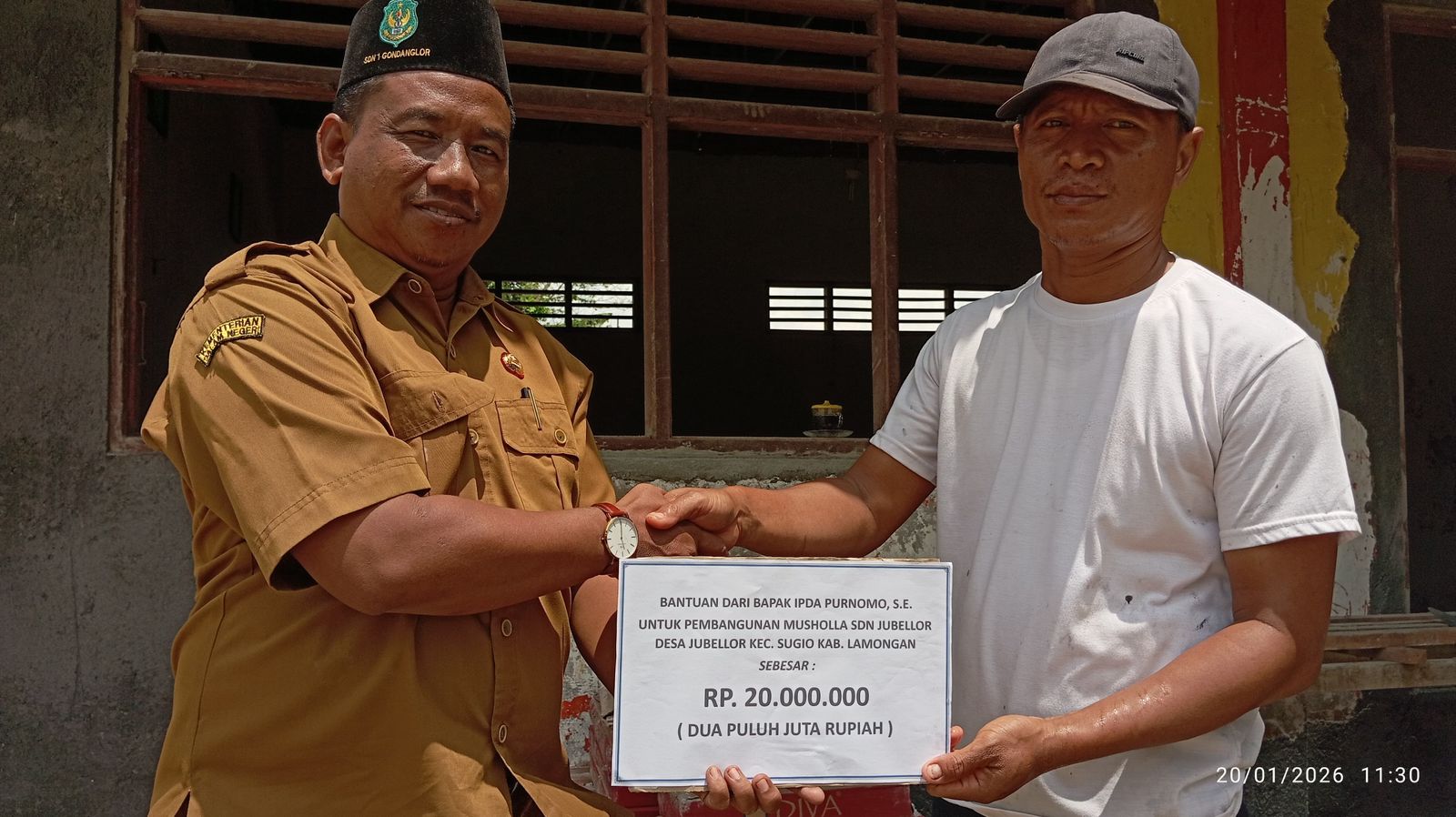 Informasiindo.com//LAMONGAN – Sebanyak Rp 20 juta diberikan Ipda Purnomo untuk melakukan perbaikan mushola yang berada di lingkungan Sekolah Dasar Negeri (SDN) Jubellor, Kecamatan Sugio, Kabupaten Lamongan, Jawa Timur, Rabu (21/1/2026).
