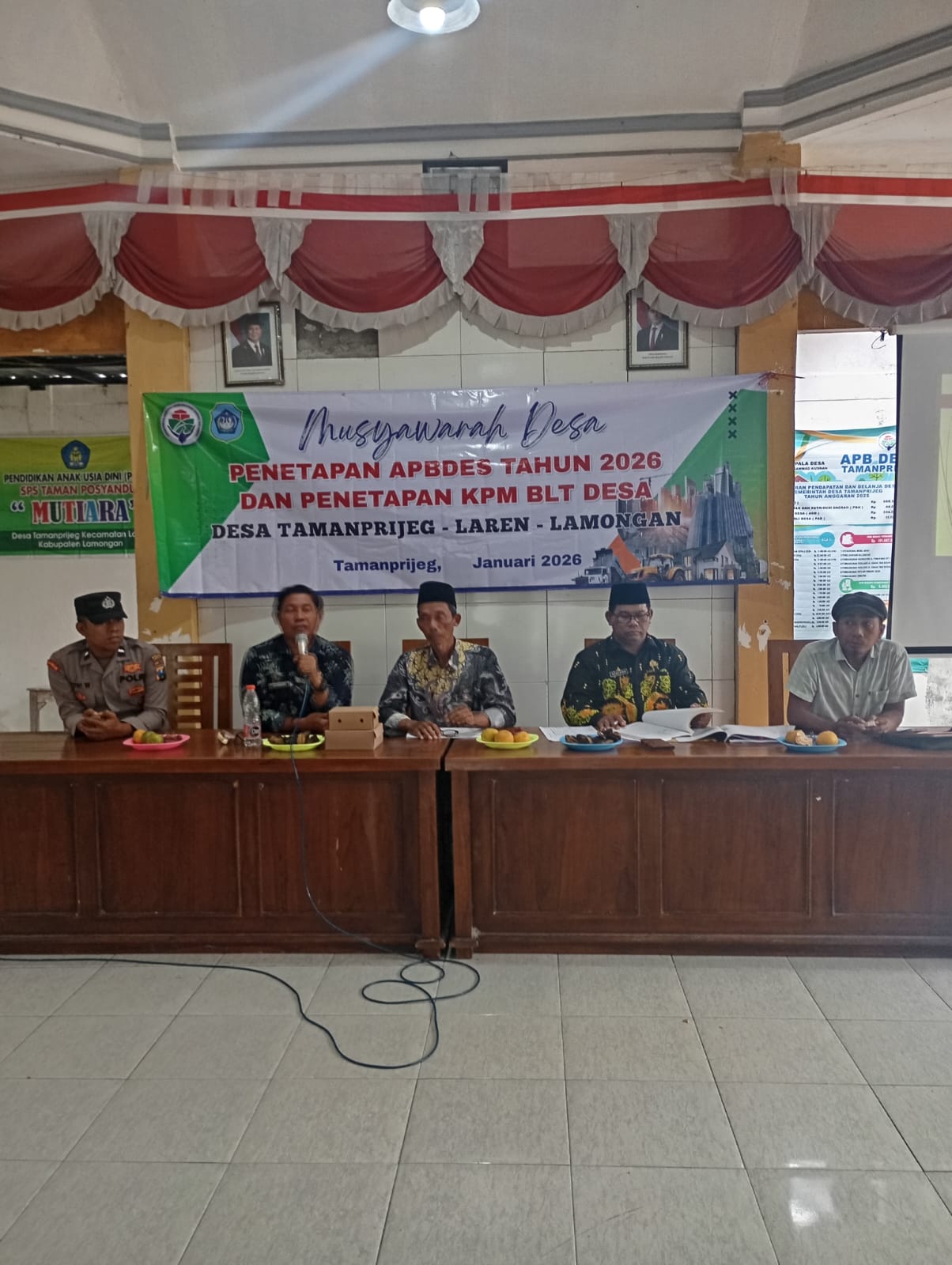 Informasiindo.com//LAMONGAN – Aipda Andri Dwi W. sebagai Bhabinkamtibmas telah menghadiri Musyawarah Desa (Musdes) di Balai Desa Tamanprijeg, Kecamatan Laren, Kabupaten Lamongan. Kegiatan ini berlangsung pada hari Kamis (15/01/26) pukul 09.00 WIB hingga selesai, membahas laporan realisasi APBDes 2025, penetapan APBDes 2026, serta penetapan Keluarga Penerima Manfaat (KPM) Bantuan Langsung Tunai Dana Desa (BLT DD) tahun 2026.