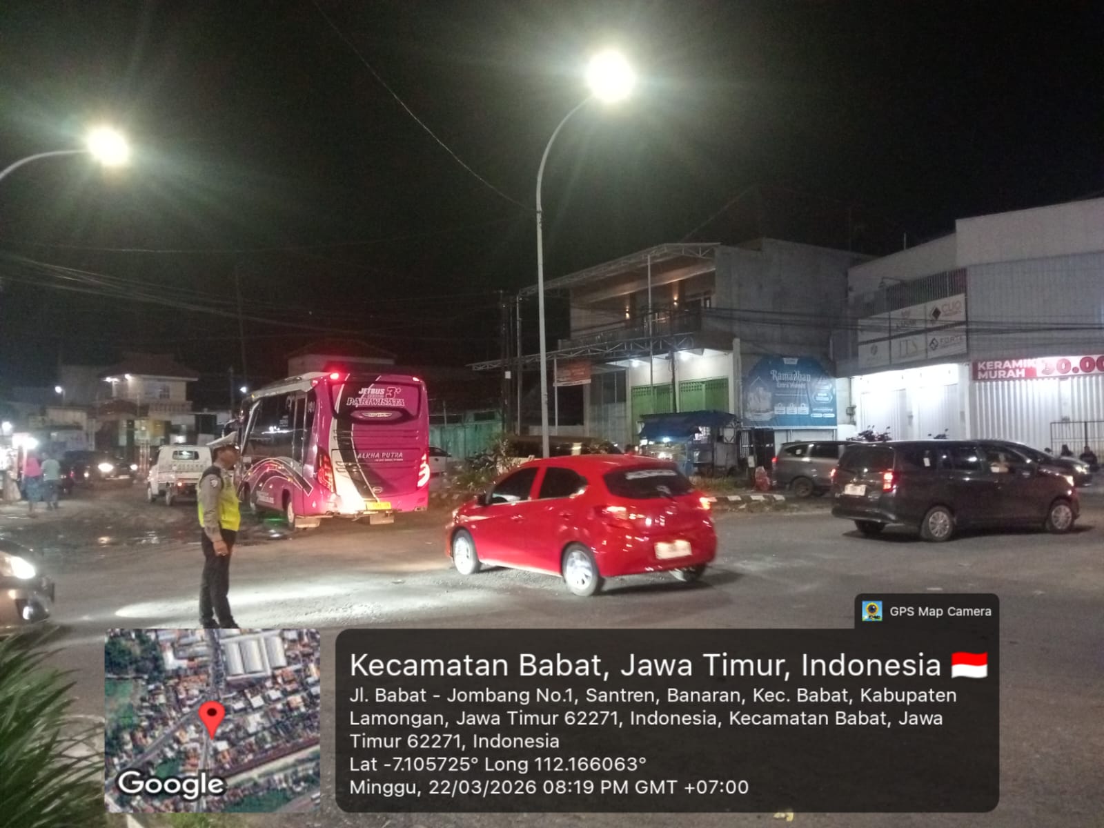 Informasiindo.com//LAMONGAN – Memasuki periode puncak aktivitas masyarakat dalam rangka menyambut hari raya, jajaran personel gabungan di bawah naungan Pospam Pasar Babat terus bersiaga. Pada Minggu (20/03/2026) malam, petugas melakukan pengaturan lalu lintas intensif di salah satu titik tersibuk, yakni kawasan Bundaran Tugu Wingko Babat.