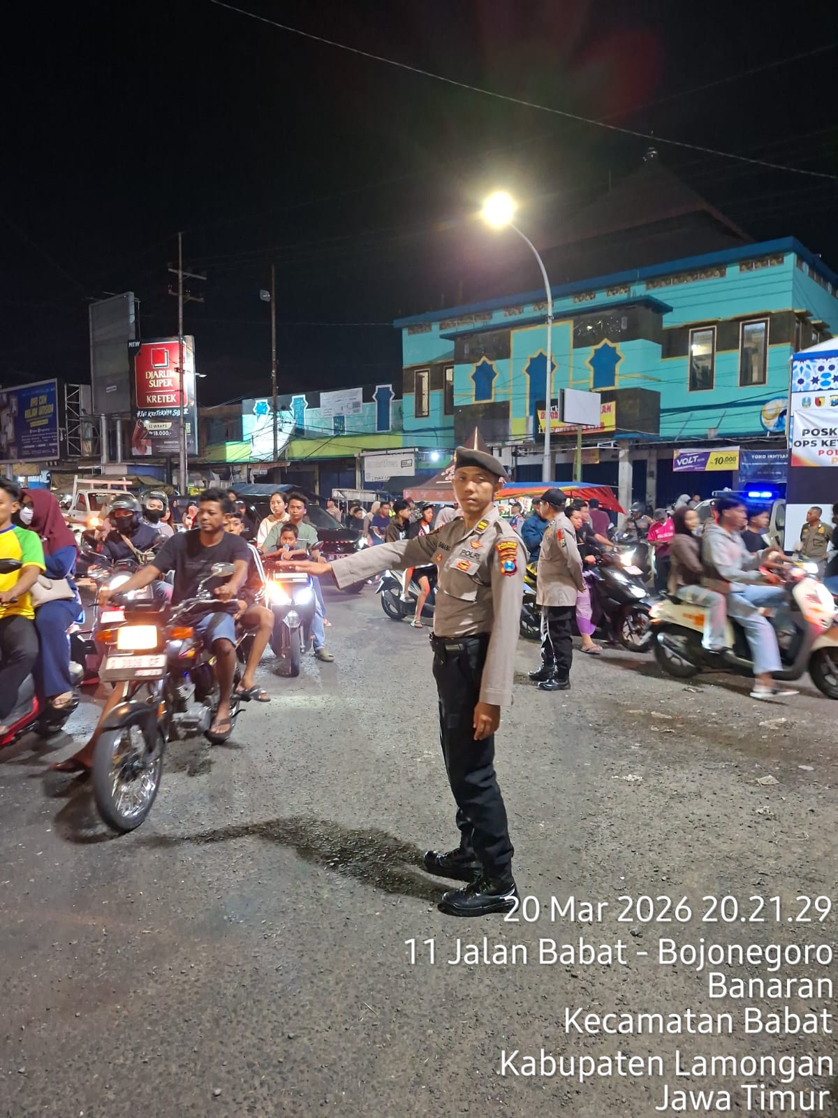 Informasiindo.com//LAMONGAN – Dalam rangka mensukseskan Operasi Ketupat Semeru 2026, jajaran personel gabungan di bawah komando Pospam Pasar Babat melaksanakan kegiatan pengaturan lalu lintas malam hari pada Jumat (20/03/2026). Langkah ini diambil guna memastikan keamanan dan kenyamanan masyarakat di titik-titik rawan kemacetan, terutama di sekitar kawasan Bundaran Tugu Wingko Pasar Babat.
