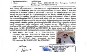 Informasiindo.com//LAMONGAN – Seorang pelajar perempuan bernama Diana Mayasari (16 tahun) dari MAN 2 Lamongan telah hilang sejak hari Senin (19/1/2026). Keluarganya akhirnya melaporkan peristiwa ini ke Polsek Babat pada hari Jumat sekitar pukul 18.00 WIB.