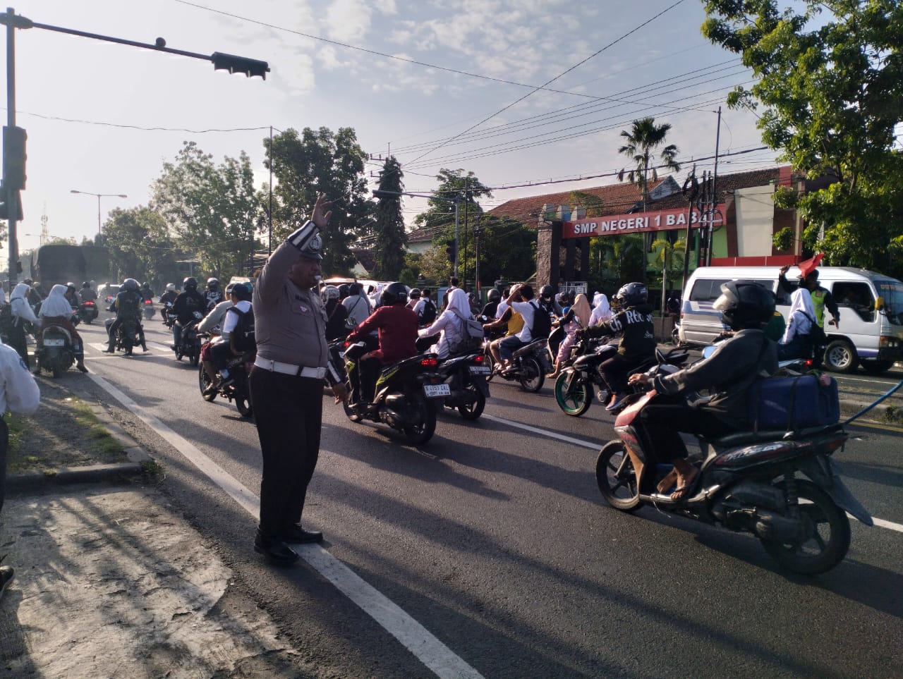Informasiindo.com//LAMONGAN – Polsek Babat melalui anggota Aipda M. Imam M melaksanakan kegiatan Commander Wish (CW) pengaturan arus lalu lintas pada hari Senin (09/02/2026) mulai pukul 06.20 WIB hingga selesai, berlokasi di sekitar SMP Negeri 1 Babat.
