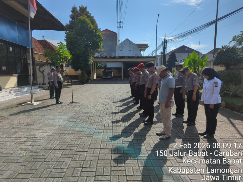 Informasiindo.com//LAMONGAN – Polsek Babat menggelar apel pagi rutin pada hari Senin pagi (02/02/2026) sekitar pukul 08.00 WIB di Makodai Polsek Babat. Kegiatan yang diikuti oleh 14 personel Polri ini dipimpin langsung oleh AKP Mashur.