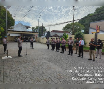Informasiindo.com//LAMONGAN  – Polisi Sektor (Polsek) Babat, Polres Lamongan, melaksanakan apel pagi rutin pada hari Jum’at (05/12) pukul 08.00 WIB hingga selesai di Markas Operasi (Mako) Polsek Babat. Acara diikuti oleh 16 personel Polri dan dipimpin langsung oleh Kapolsek Babat Kompol Chakim Amrullah, SH, MH