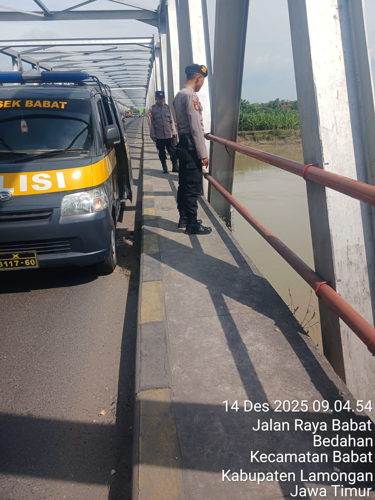 Kegiatan dipimpin oleh Pawas Polsek Babat Iptu Bambang S, S.H., bersama dengan Aipda Agus B dan Bripka Dwik. Selama patroli, tim memeriksa kondisi bantaran sungai dan mencatat ketinggian muka air yang tercatat stabil pada angka 6.40 mdpl.