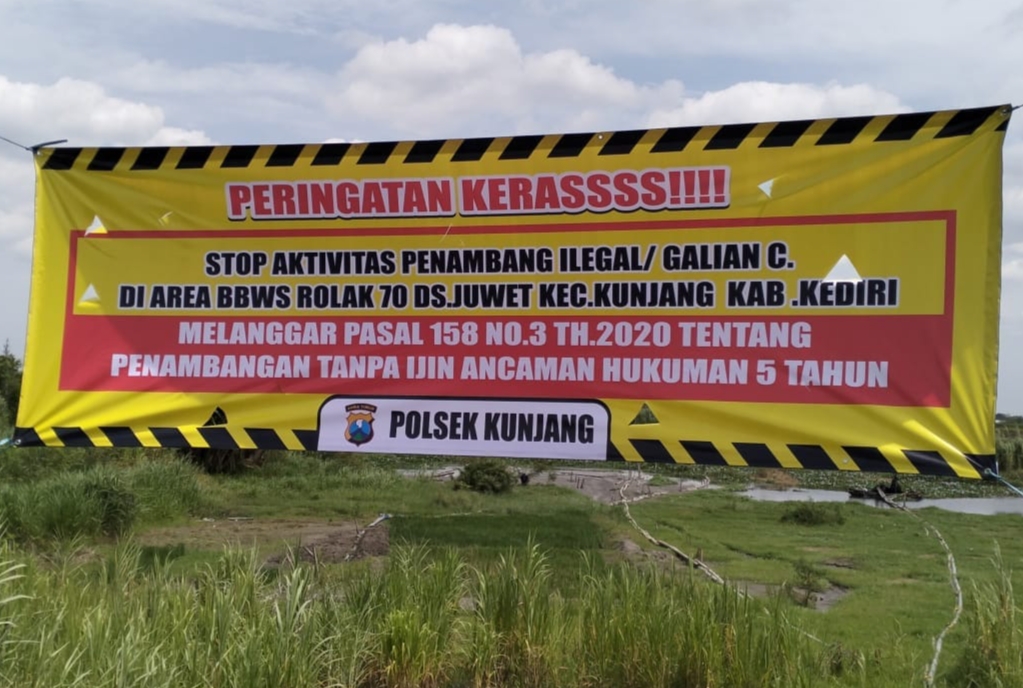 Kediri//informasiindo.com– Polsek Kunjang memasang spanduk peringatan keras terkait larangan aktivitas penambangan ilegal di wilayah Daerah Aliran Sungai (DAS) Brantas, tepatnya di area BBWS Rolak 70, Desa Juwet, Kecamatan Kunjang, Kabupaten Kediri.