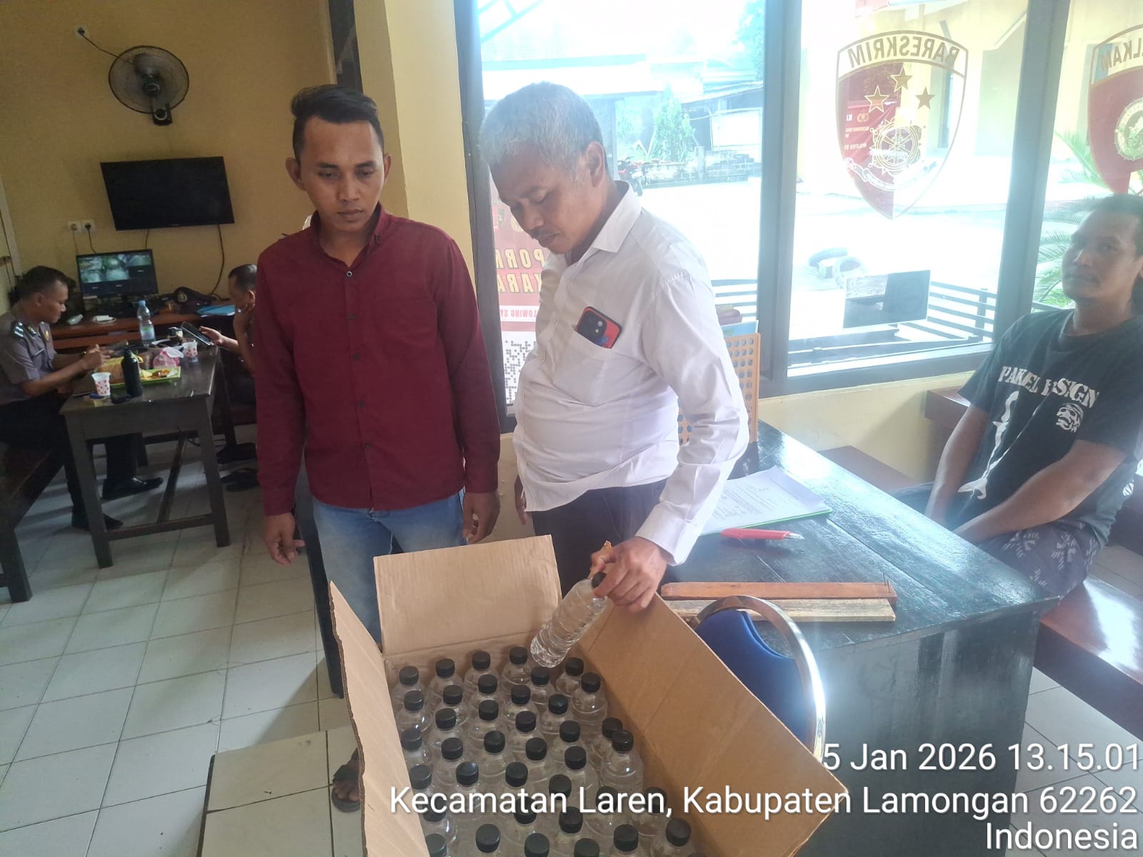 Pada hari Senin (05/01/2026) pukul 12.00 WIB, saat melakukan patroli rutin di Desa Gampangsejati, Kecamatan Laren, petugas mendapatkan informasi adanya warga yang menjual minuman keras. Setelah menindaklanjuti informasi tersebut, tim petugas mendatangi rumah berinisial N,I,M (29 tahun, Pelajar/Mahasiswa, alamat Ds. Gampangsejati RT 003/RW 003) dan menemukan barang bukti berupa 1 peti kayu berisi 50 botol arak bali @600 mililiter (total 30 liter).