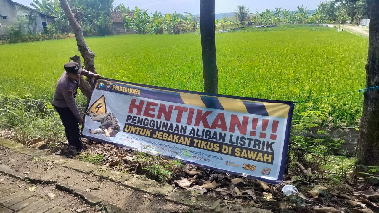 Pada pukul 11.30 WIB, petugas yang terdiri dari Aipda Andri dan Bripda Ach. Tomi memasang banner himbauan di area persawahan agar masyarakat tidak memasang aliran listrik di sawah sebagai jebakan hama tikus. Langkah ini diambil untuk menghindari risiko bahaya terhadap warga maupun orang yang melintas di sekitar area tersebut.
