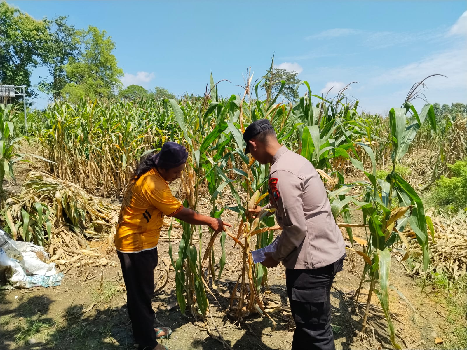 Petugas yang terlibat yaitu Aipda Tri dan Bripda Ilham bekerja sama dengan para petani untuk melakukan pengecekan kondisi lahan yang ditanami jagung. Tujuan dari kegiatan ini adalah memastikan tanaman tumbuh dengan optimal serta mengidentifikasi kendala apa saja yang dihadapi oleh petani selama proses budidaya.