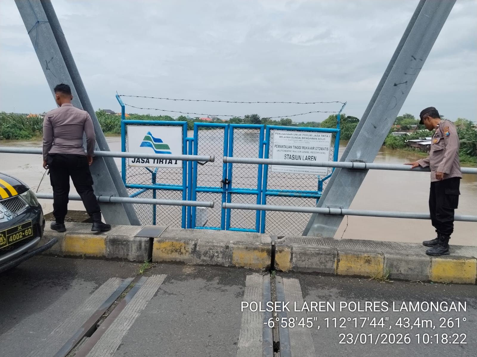 Kegiatan ini dilakukan oleh petugas Aipda Arif dan Bripda Ilham sebagai bagian dari upaya antisipasi potensi banjir di wilayah hukum Polsek Laren. Hasil pengamatan menunjukkan bahwa ketinggian air Bengawan Solo pada hari tersebut terpantau pada titik 4.90 meter.