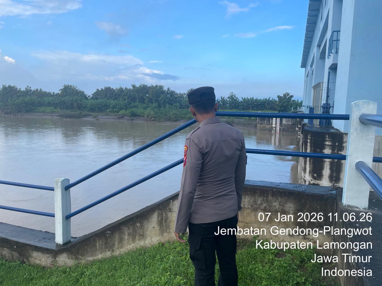 Informasiindo.com//LAMONGAN – Polsek Laren melaksanakan patroli dan monitoring ketinggian permukaan air Sungai Bengawan Solo pada hari Rabu (07/01/2026) pukul 11.00 WIB hingga selesai, dengan lokasi pengamatan di Floodway Plangwot.