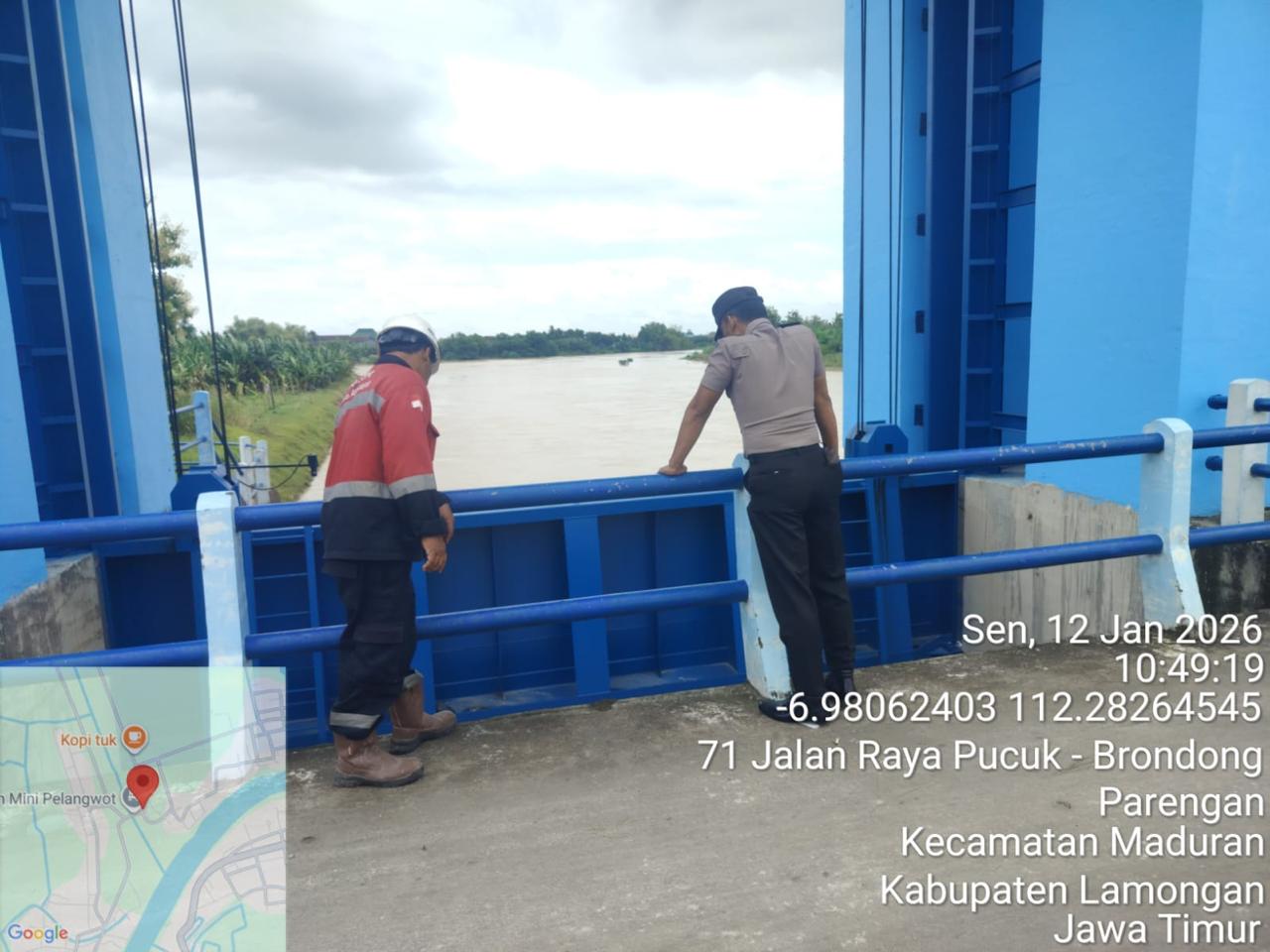 Informasiindo.com//LAMONGAN – Polsek Laren melakukan patroli pengecekan dan monitoring ketinggian permukaan air Sungai Bengawan Solo pada hari Senin (12/1) pukul 10.50 WIB di lokasi Floodway Plangwot. Kegiatan ini dilakukan untuk memastikan kondisi sungai tetap terkendali dan memberikan informasi akurat kepada masyarakat.
