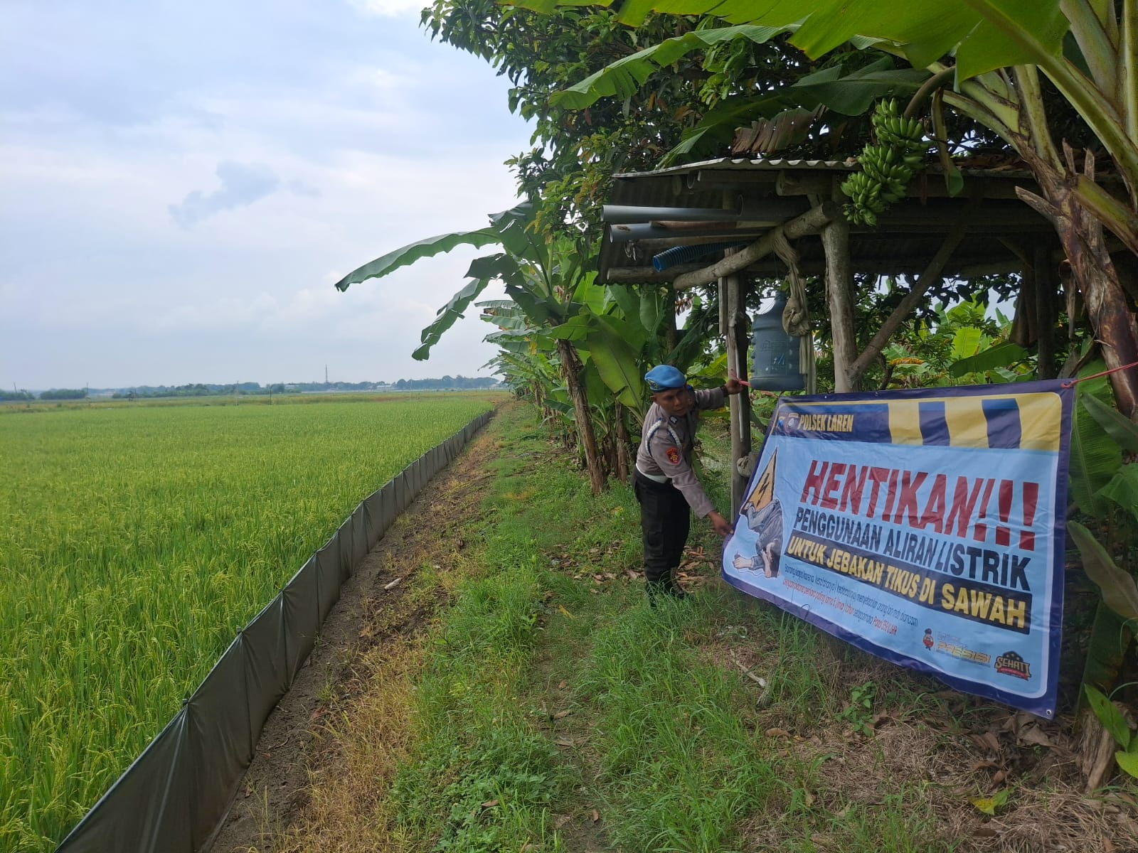 Banner yang dipasang bertujuan memberitahukan warga agar tidak menggunakan aliran listrik di sawah sebagai jebakan hama tikus. Alasan utama adalah karena tindakan tersebut berpotensi membahayakan warga atau orang yang melintas di sekitar persawahan, yang dapat menyebabkan sengatan listrik yang berbahaya bahkan fatal.