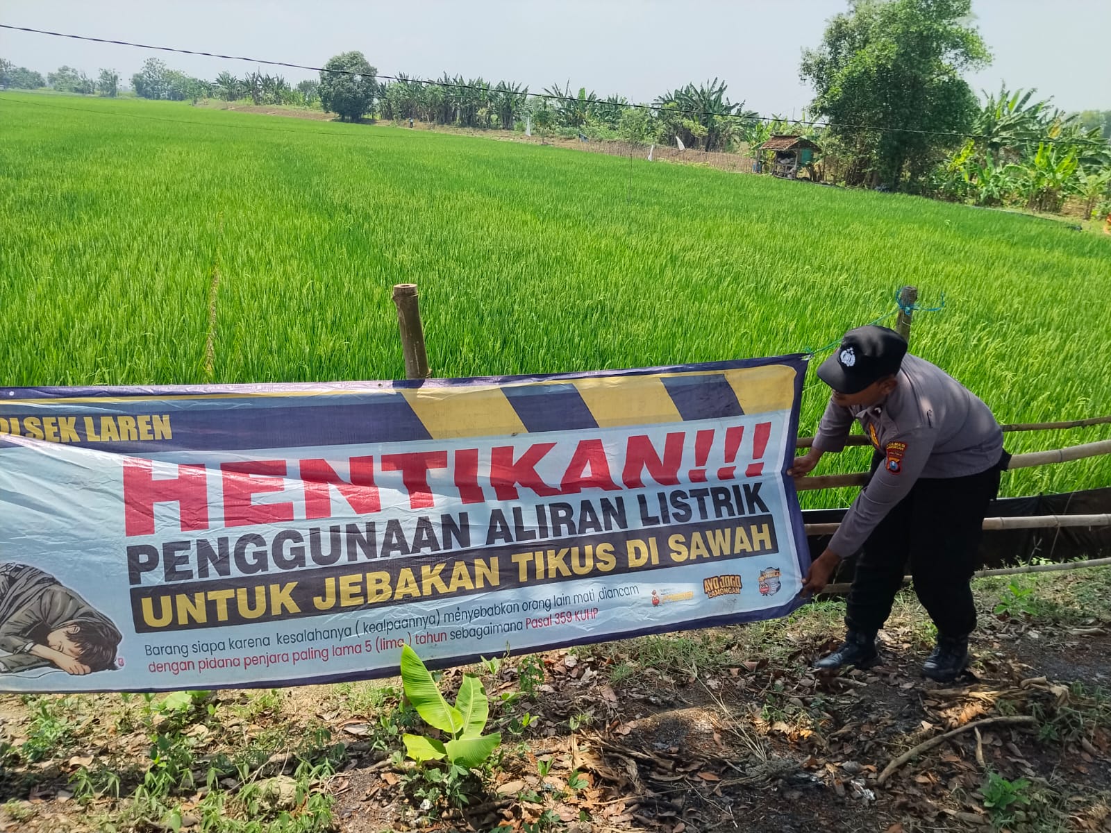 Kapolsek Laren AKP Witono Hariadi, S.H. mengatakan, “Kami menyadari bahwa hama tikus dapat mengganggu hasil panen petani, namun penggunaan aliran listrik sebagai jebakan sangat berbahaya dan berpotensi menimbulkan korban jiwa. Melalui pemasangan banner ini, kami berharap masyarakat dapat lebih memahami risikonya dan menggunakan cara yang aman serta benar dalam mengatasi masalah hama tikus di persawahan.”