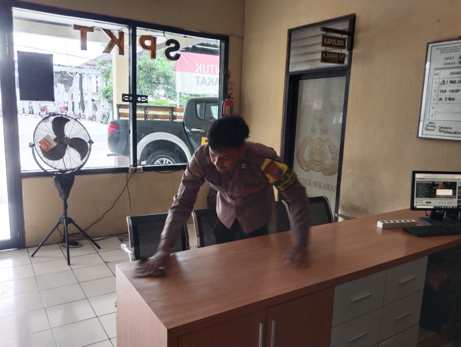 Kegiatan ini dilakukan oleh Aiptu Sukiyat dan Briptu Firnanda di Mapolsek Sekaran. Selain menjaga keamanan dan kesiapsiagaan markas, petugas juga membersihkan ruangan-ruangan serta lingkungan sekitar untuk memastikan Mapolsek tetap dalam kondisi rapi dan nyaman.