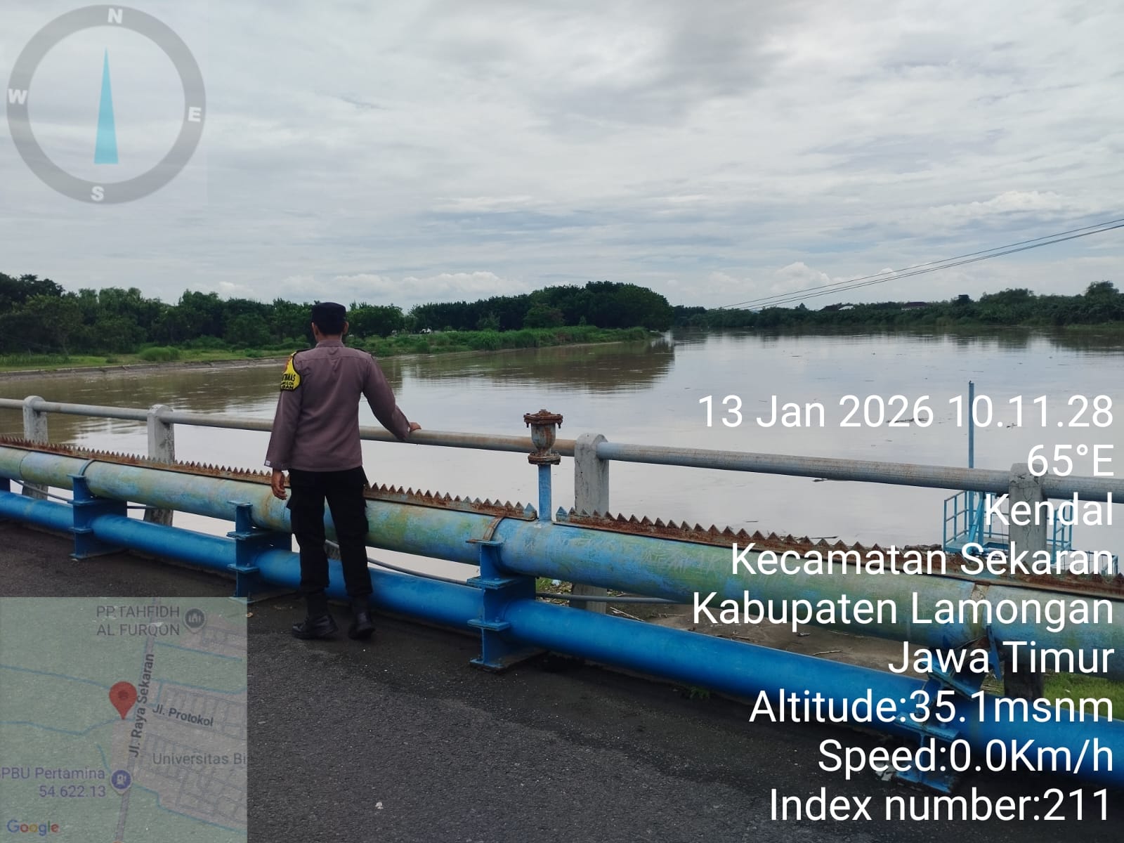 Informasiindo.com//LAMONGAN – Mengantisipasi potensi bencana alam akibat musim hujan, Polsek Sekaran Kabupaten Lamongan melaksanakan Patroli Kota Presisi (PKP) Harkamtibmas dan pemantauan kondisi wilayah rawan bencana pada hari Selasa (13/1) pukul 10.00 WIB. Kegiatan ini mencakup pemukiman masyarakat, area rawa, serta sepanjang aliran anak Sungai Bengawan Solo dan pintu air di Kecamatan Sekaran.