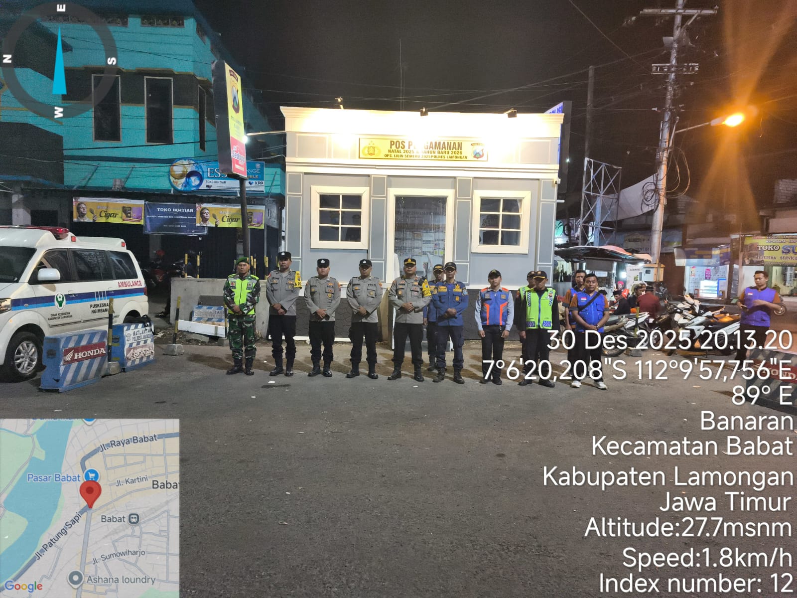 Informasiindo.com//LAMONGAN – Pos PospamPasar Babat melaksanakan apel serah terima tugas pengamanan malam hari dalam rangka Operasi Lilin Semeru 2025 pada hari Selasa (30/12/2025) sekitar pukul 20.00 WIB di lokasi Pospam Pasar Babat. Kegiatan ini dipimpin oleh Kapospam Pasar Babat, Kompol Chakim Amrullah, SH, MH