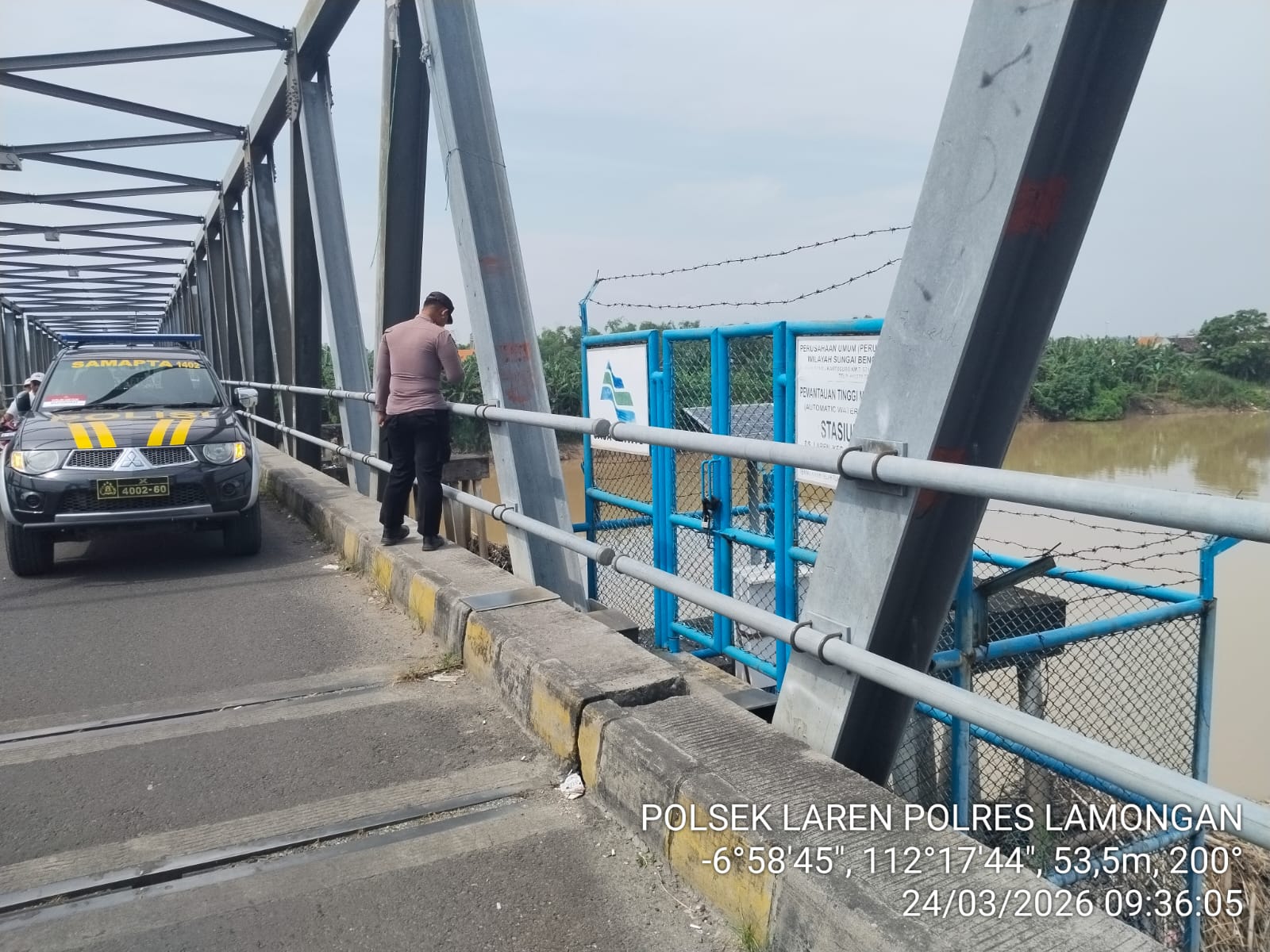 Kegiatan monitoring yang dimulai pukul 09.30 WIB ini difokuskan di titik pantau Jembatan Laren. Dua personel Polsek Laren, Aipda Tri dan Bripda Ilham, dikerahkan untuk memantau langsung fluktuasi debit air sebagai bentuk deteksi dini penanggulangan bencana banjir.